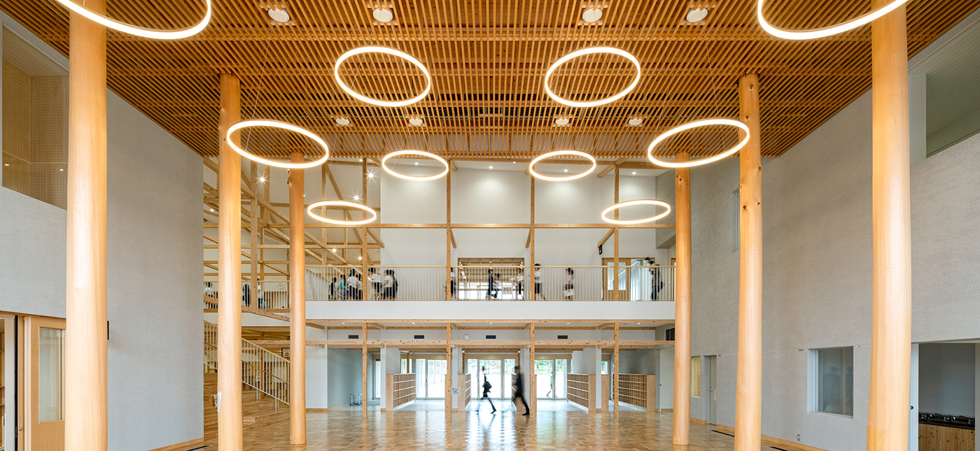 集会などに使用される多目的広場には、樹齢50年を超える地元産ヒノキの磨き丸太8本が立てられ、シンボルツリーとして圧巻の存在感を放っています。さらに、幅6メートルの大階段をはじめ、図書スペースや教室、廊下に至るまで、地域産木材がふんだんに使われています。