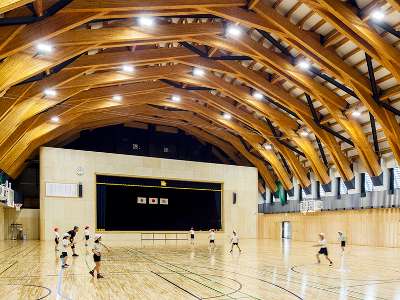 屋内運動場には、国産カラマツや岐阜県産ヒノキをふんだんに使用。当社は木架構の材料調達、プレカット加工、建て方までを手掛けました。木の温もりと香りに包まれ、地域の木材を活かした大空間が広がります。